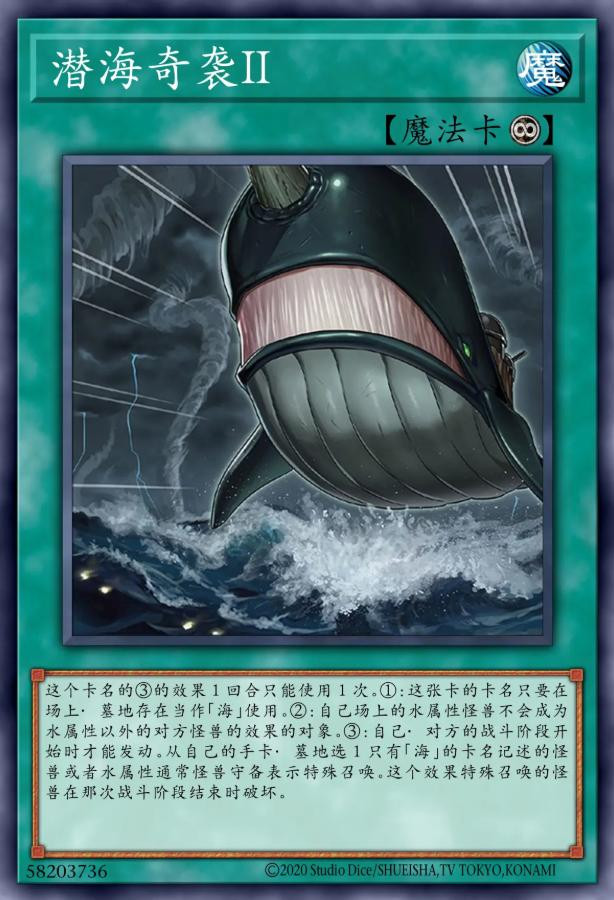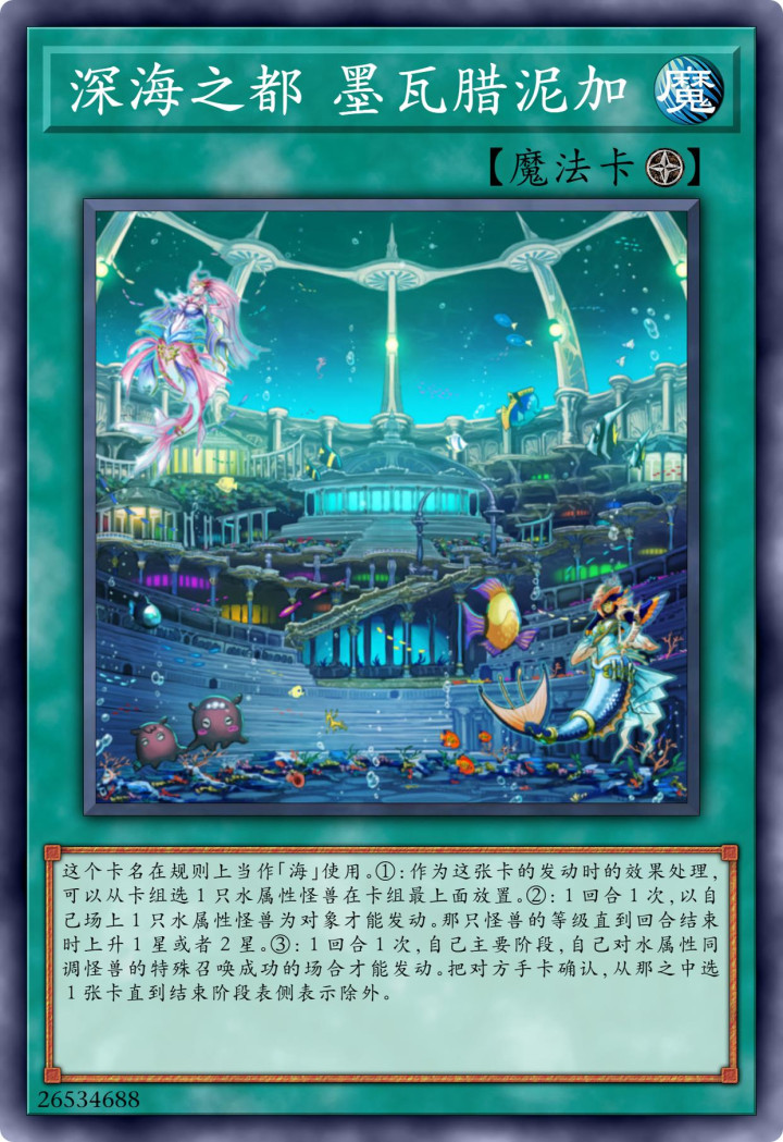 能被当成“海”使用的同时,场上的水属性怪兽攻击力跟守备力就会得到200点数值的增幅。一回合一次,主阶段的时候,我方场上的水属性怪兽等级直到回合结束前都能上升我方场上水属性怪兽数量相同的数值。