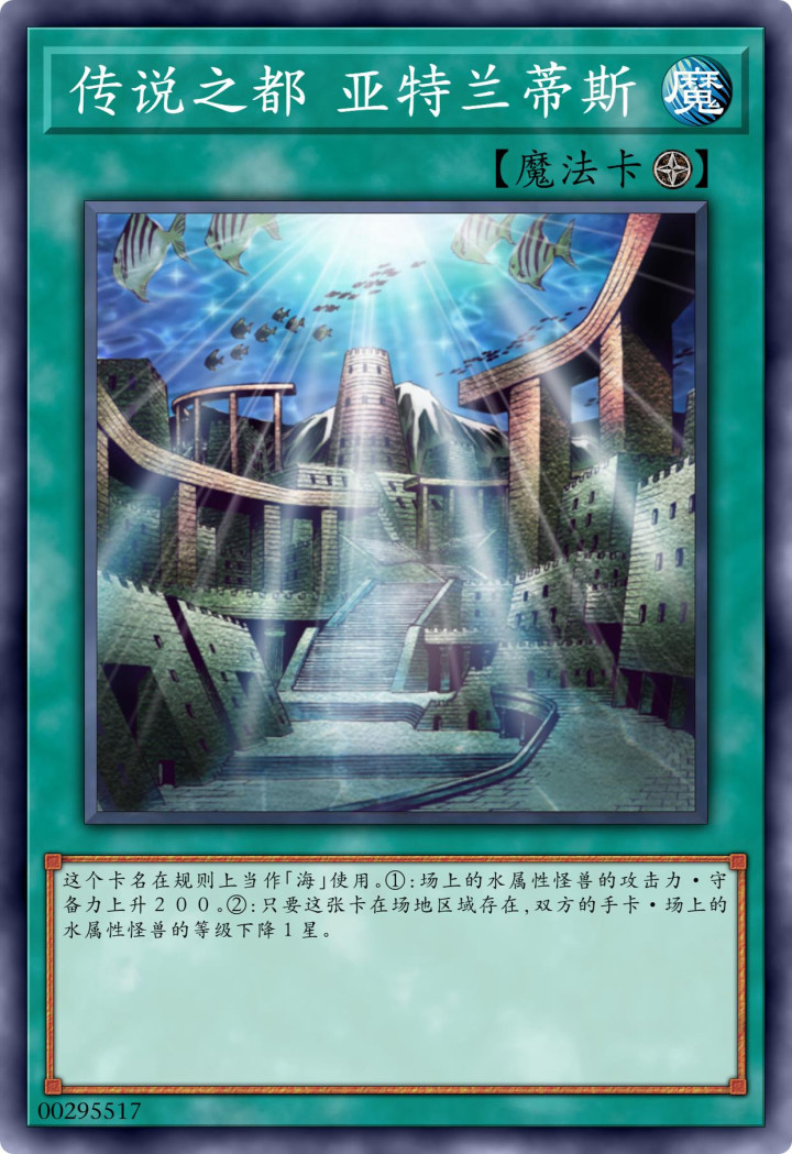亚特兰蒂斯,被认为是“失落的大陆”,有人认为迄今为止还没有寻找到,也有人认为它已经沉没,在海洋的深处存在着。因此,亚特兰蒂斯在《游戏王》当中,也是以深海城市的形象存在的,还能被当成是“海”的同名卡,只是效果方面相对于原本的海有一定区别。